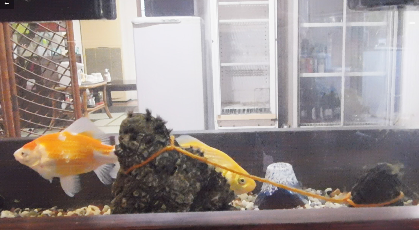 | 3年前にやってきた新しい金魚ですが、伊勢志摩サミットにちなんで「伊勢志摩」と「サミット」と名付けました。 ところが飼ってすぐに流金の「伊勢志摩」が亡くなってしまいました。 残った和金の「サミット」は元気に成長し大変大きくなり、元気に水槽を泳いでいます。玄関入って右側にいるので是非ご覧ください。 |