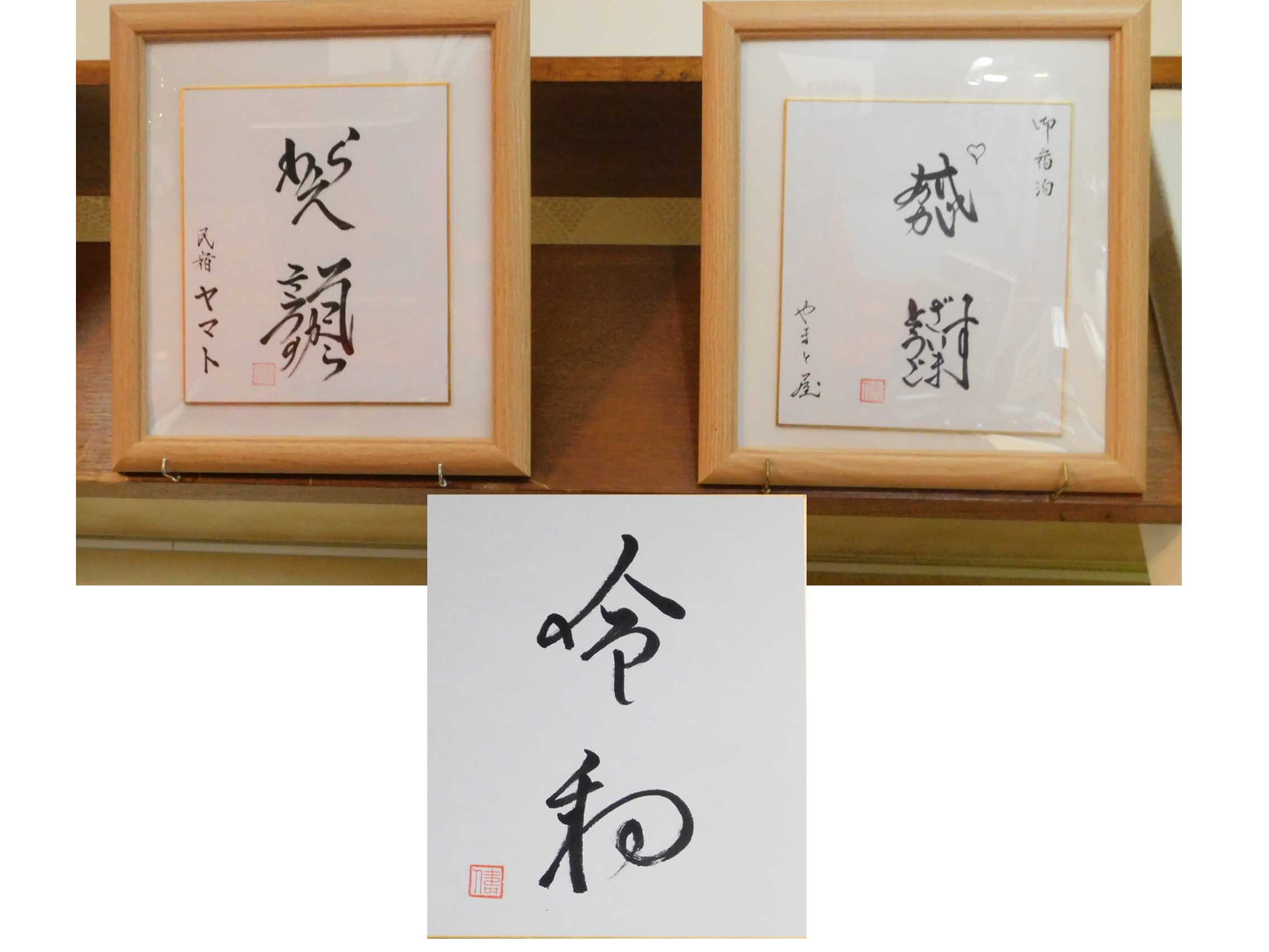 | この色紙の文字読めますか? 3枚の内、右上の文字は「感謝」ですが、ひらがなで「ありがとうございます」で出来ています。 残りの「笑顔」と「令和」は何という文字でしょうか? この色紙は、知り合いの方で字の上手な方がいて、特技を生かして書いたものを頂きました。 民宿ヤマトのロビーに掲示してあります。 |